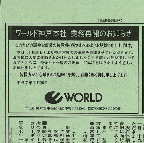 幸い身内で亡くなった人はいなかったものの、震災前に魚釣りに一緒に行っていたワールド社員の方や、子供が通っていた六甲道の幼稚園のお友達や家族が犠牲になったり、家が全壊した方がたくさんいました。今のようにSNSもなく、情報はテレビとラジオのみで、ボランティア組織もなかった当時、被害が大きかった所は大変だったと思います。